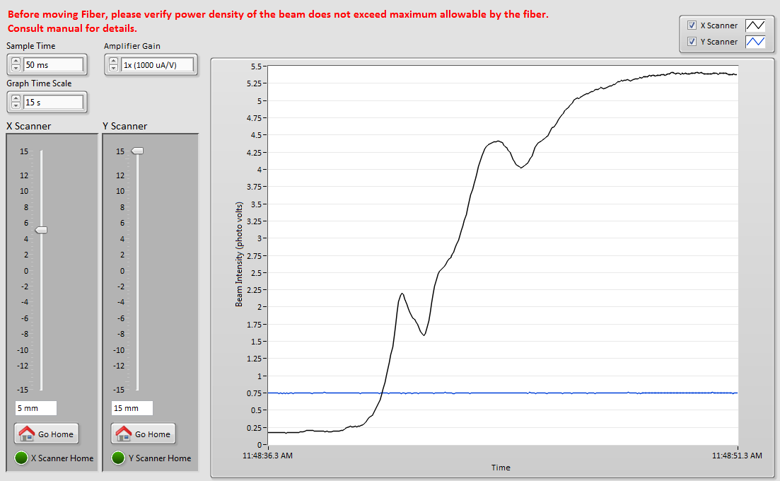 The software also has a fixed position mode, which enables the operator to move the fiber to a fixed position, and the software will plot the beam intensity versus time at this position. The plot format is a strip chart, where the chart window period can be set by the operator. Sampling rates up to 1000 Hz are achievable in this mode.