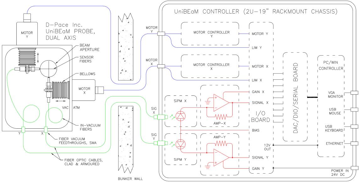 UniBEaM is a particle beam profiling system - similar to a wire scanner except an optical sensor fiber is used instead of a metal wire. Ø50 µm to 400 µm sensing fibers scintillate in the visible spectrum as they pass through the beam. The scintillation light is transmitted through the short sensor fiber into a standard multimode optical fiber, which transmits the light long distances with minimal attenuation and no electromagnetic susceptibility. The light is converted by a high-sensitivity photo sensor located in the UniBEaM controller, amplified, digitized, and displayed on a monitor. UniBEaM was conceived by the AEC-LHEP of the University of Bern and commercialized by D-Pace.
