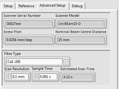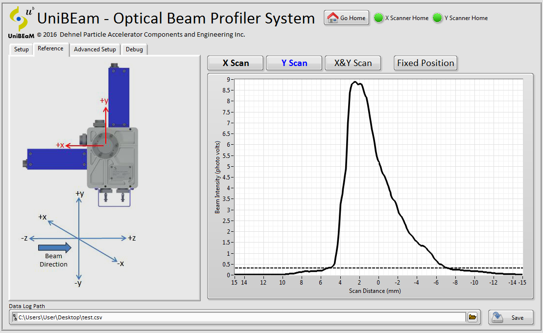 The user controls the scan start and end positions, position resolution and scan speed. Single or continuous scans can be acquired. Each pass of the fiber can be displayed separately, or overlain in persistent display mode. The fiber scanning speed is adjustable to a maximum speed of 18 mm/sec. A delay period can be entered which pauses the fiber at the extents at its travel to allow the fiber too cool between passes through the beam. Slowing the scanning speed enables greater signal averaging for improving the signal-to-noise ratio of low beam currents. The software also calculates the beam position based on first moments and the integral of the profile. Profiles are saved in a CSV format file along with software parameters and user comment fields.